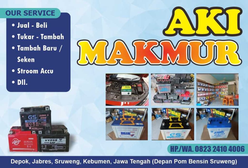 Aki Makmur Yang beralamat di Sruweng Kebumen , selalu menjual produk yg BERKUALITAS DAN BERGARANSI, dan kami melayani pemasangan di alamat pemesan atau di outlet kami dengan tenaga yang profesional dan beretika.