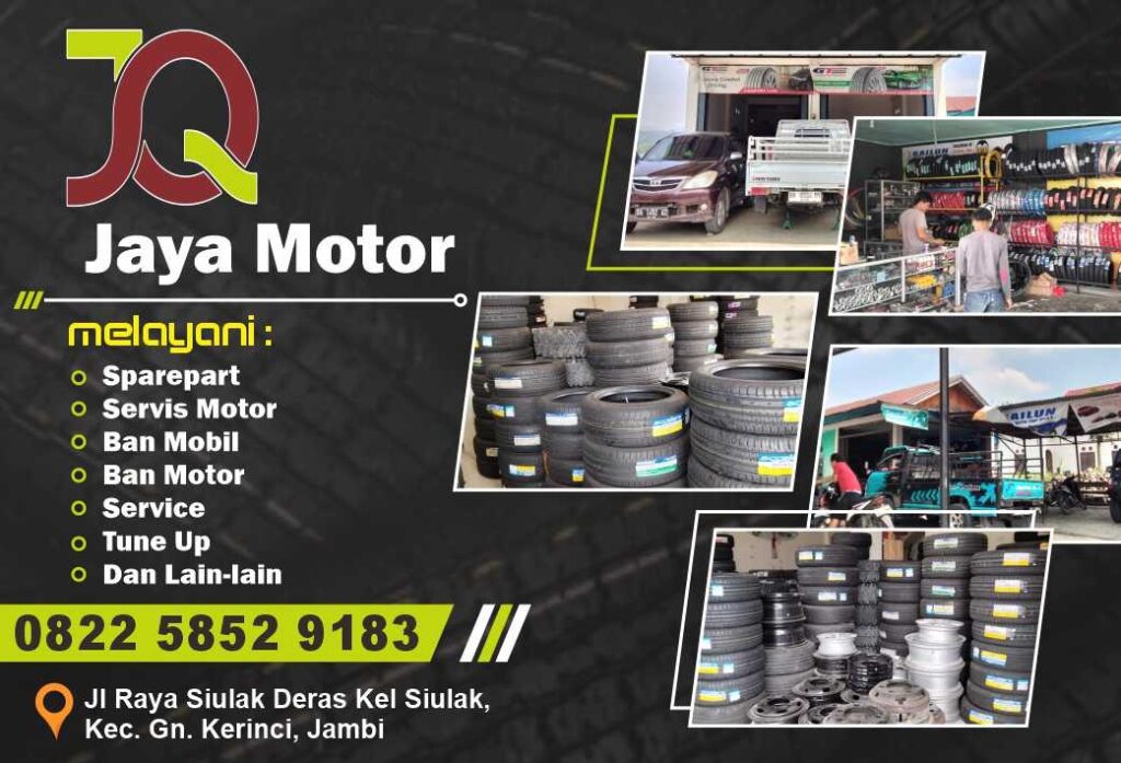 JQ Jaya Motor adalah salah satu Toko SPAREPART terlengkap di Sungai penuh Kerinci Jambi. Selain menyediakan berbagai macam perlengkapan untuk motor , disini juga memberikan pelayanan service motor dan mobil juga menyediakan service ringan lainnya. Di toko JQ JAYA MOTOR juga menyediakan berbagai macam merk ban untuk motor dan ban mobil , melayani pemesangan dan perawatan lainnya.
