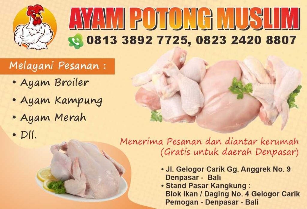 Ayam Potong Kami terjamin kualitas, kesehatan dan kebersihannya sehingga aman untuk dikonsumsi. Saat ini produk Kami telah digunakan untuk kebutuhan rumah tangga dan Hotel, Restoran, Catering , Café, dll. Pelayanan utama kami adalah untuk pemesanan dalam jumlah banyak kami berikan fasilitas pengantaran gratis untuk wilayah Denpasar.