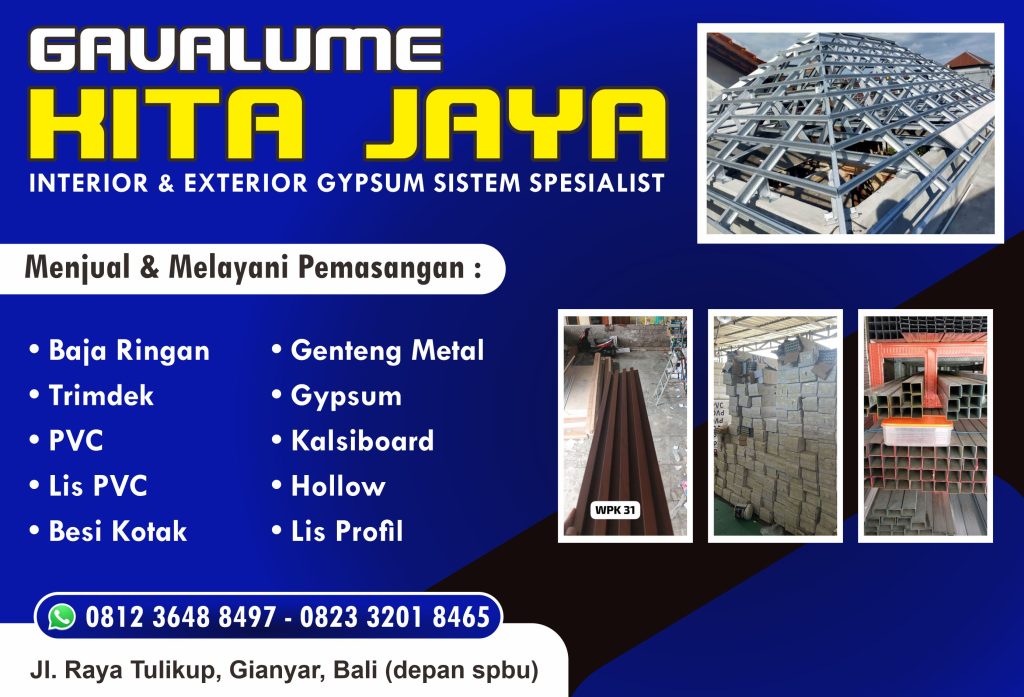 Toko Galvalum Kita Jaya hadir sebagai solusi terbaik untuk kebutuhan material bangunan modern dan berkualitas. Kami menyediakan berbagai produk seperti baja ringan, trimdek, genteng metal, lis profil, kalsiboard, PVC, list PVC, hollow, gypsum, serta melayani jasa pemasangan profesional.